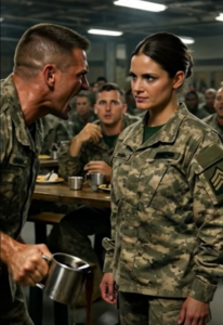 Coffee exploded across the wooden surface, splashing in dark arcs that seemed to hang in the air for a split second too long. Conversations died mid-sentence. Forks froze halfway to mouths. Every soldier in the crowded mess hall turned at once, drawn by the sudden violence like a reflex they couldn’t control.