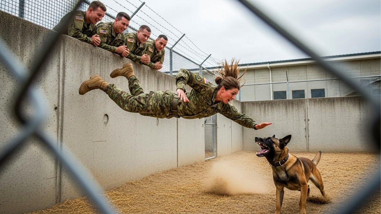 The three recruits backed up until their backs hit the fence of another enclosure. Whispers spread from the barracks as more soldiers drifted over, drawn by the commotion. Floodlights caught the scene: the quiet new girl standing tall, hands still bound, with the base’s most vicious K9 acting like a loyal shadow.