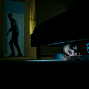 I lay flattened on my stomach beneath my own bed, cheek pressed to the dusty hardwood, heart jack-hammering so hard I was sure he could hear it. The comforter hung down like a curtain, but there was a two-inch gap between fabric and floor, through it, I could see polished brown leather shoes (the same shoes I’d seen a hundred times in photos) stop inches from my face.