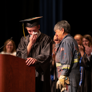 Three thousand people watched in silence as the woman in the dirty orange uniform walked beside her son in the black valedictorian gown.