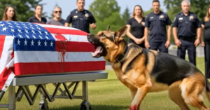The dog—Rex, a German Shepherd with years of service behind him—lunged toward the casket, nails scraping against the polished wood as if trying to dig through it. Officers rushed forward, gripping his harness, commanding him to heel, to sit, to down.